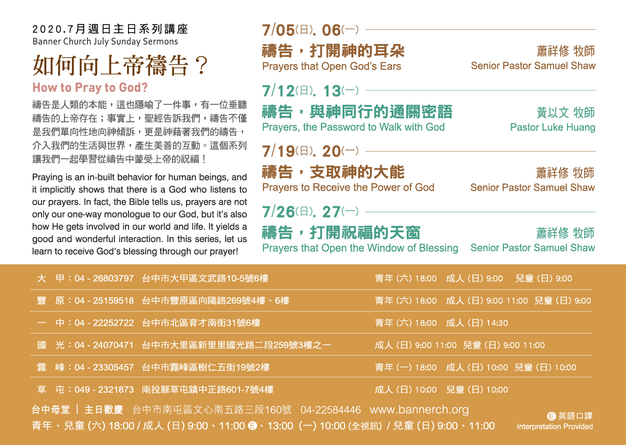 禱告是人類的本能,這也隱喻了一件事,有一位垂聽禱告的上帝存在;事實上,聖經告訴我們,禱告不僅是我們單向性地向神傾訴,更是神藉著我們的禱告,介入我們的生活與世界,產生美善的互動。這個系列讓我們一起學習從禱告中蒙受上帝的祝福!